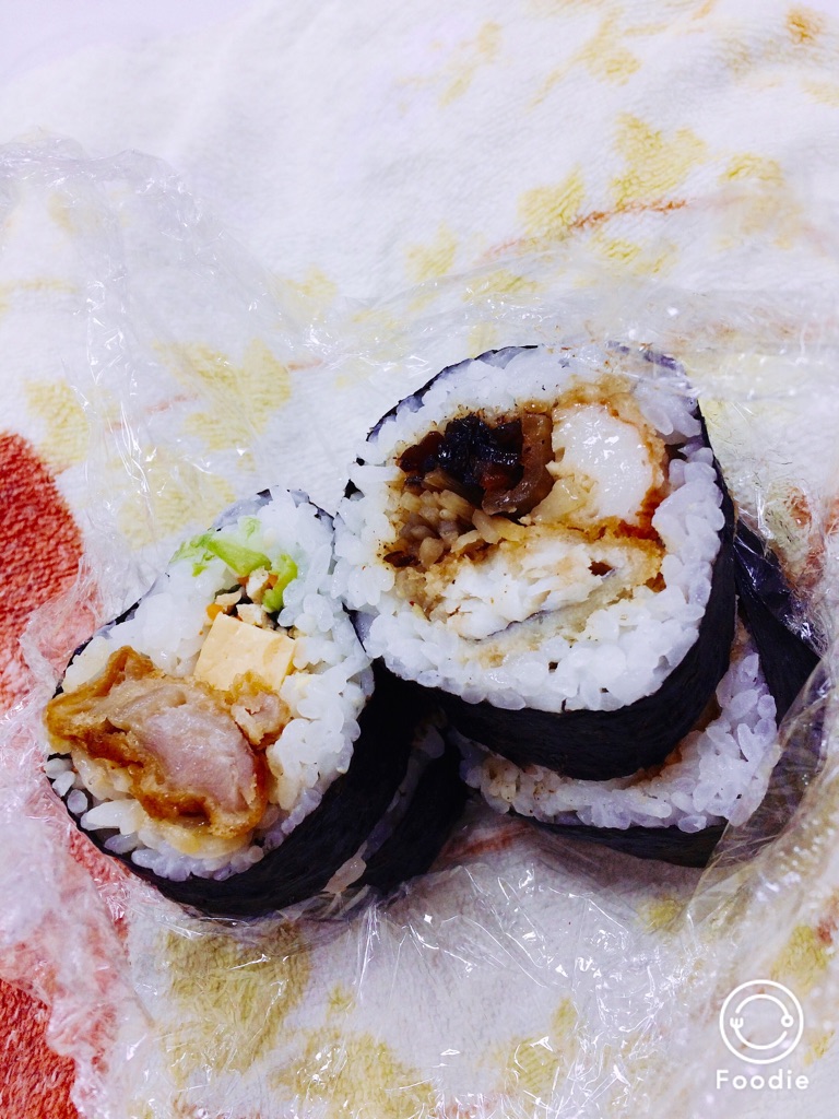 今日の授業前の間食は豪華なんじゃ!バイト先の男の子が、恵方巻きに向けて、練習で巻いたやつくれたん(´? `?)